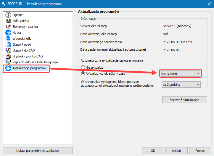 W celu ustawienia częstotliwości sprawdzania dostępności nowych aktualizacji programów SPECBUD na serwerze należy postępować zgodnie z poniższą instrukcją: