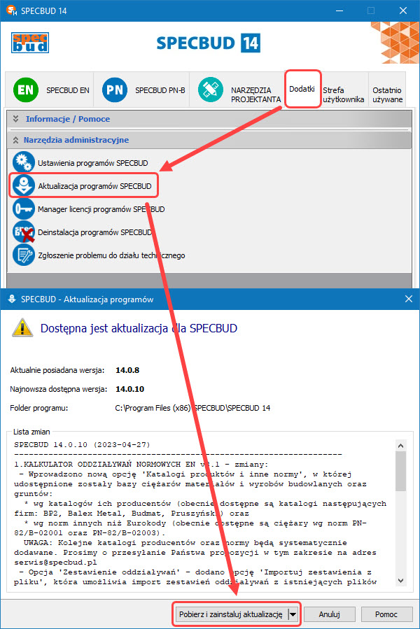 - w Starterze programów SPECBUD w zakładce Dodatki uruchomić Narzędzia administracyjne > Aktualizacja programów SPECBUD,