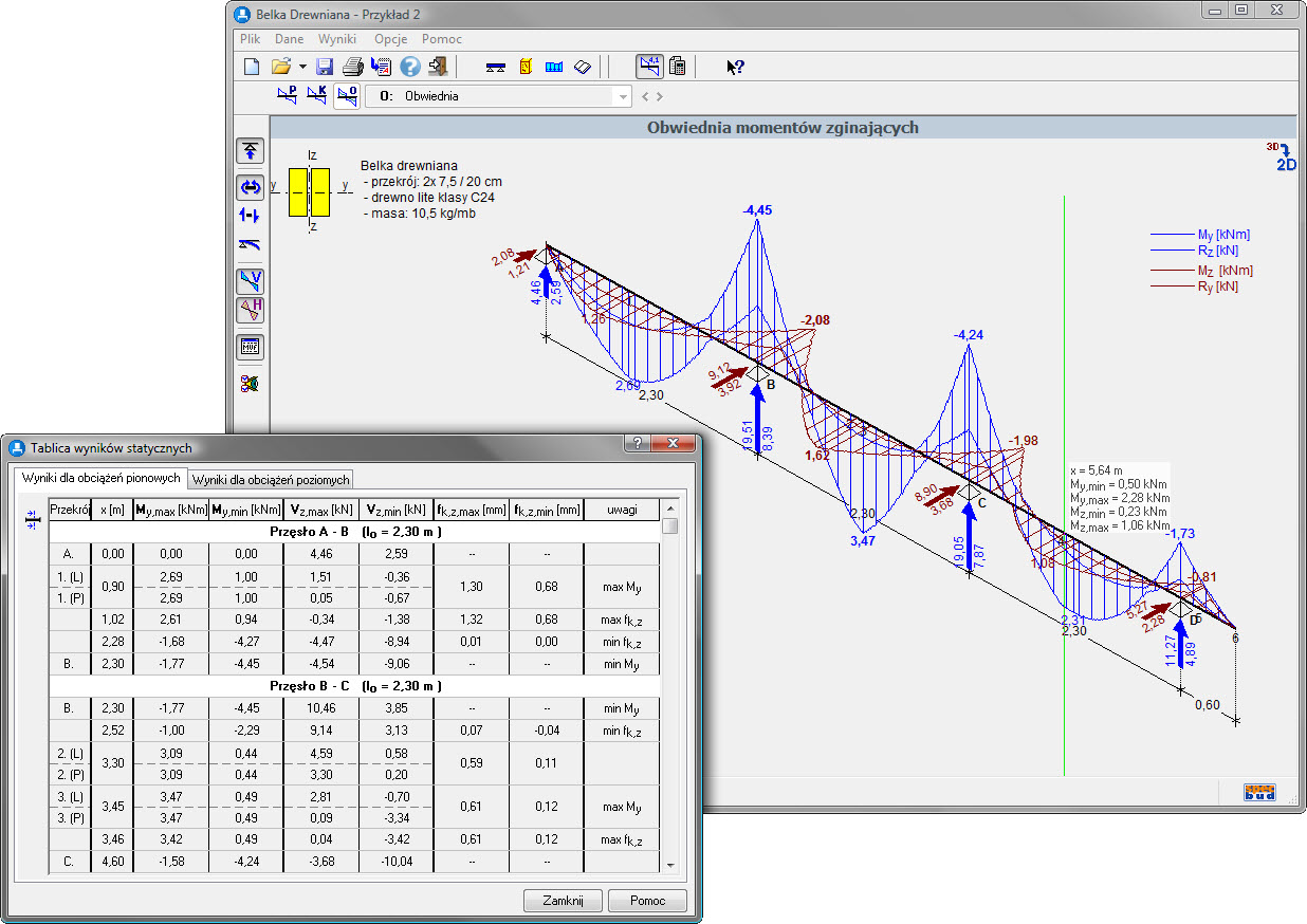 Wyniki obliczeń statycznych prezentowane są (w widoku 2D lub 3D) w postaci wykresów momentów zginających i sił poprzecznych oraz linii ugięcia belki, a także reakcji podporowych. Wielkości te podane są też w formie stabelaryzowanej dla charakterystycznych przekrojów belki i innych przekrojów wskazanych dodatkowo przez projektanta.