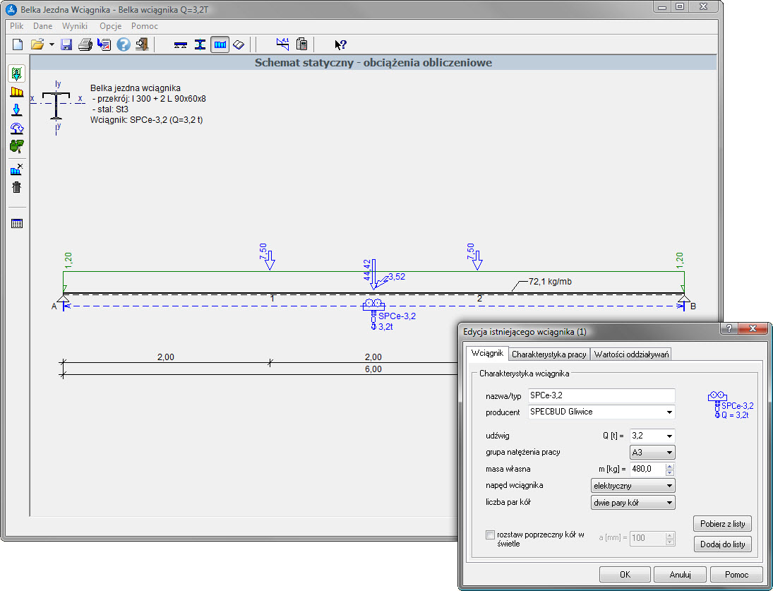 Schematem statycznym może być belka jednoprzęsłowa lub wieloprzęsłowa ciągła, także gerberowska, o prostej trasie. Zdefiniowanie schematu belki polega na określeniu liczby i rozpiętości przęseł i wsporników. Podczas obliczeń możliwa jest szybka modyfikacja schematu belki bez zmiany zadanych obciążeń. Obciążenie eksploatacyjne belki mogą stanowić dwa różne wciągniki o napędzie elektrycznym lub ręcznym (wciągniki mogą działać osobno lub jako sprzężone ze sobą). Parametry deklarowanego wciągnika pobiera się ze wcześniej utworzonej listy wciągników użytkownika, można też podać parametry nowego wciągnika w bloku ich deklaracji, a następnie przenieść je do tablicy wciągników.