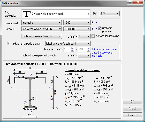 Przekrojem belki może być pojedynczy dwuteownik walcowany (I, IPE, HEB, itp.) lub dwuteownik wzmocniony nałożonym ceownikiem walcowanym albo dwuteownik z dołożonymi skrzydełkami z kątowników. Poszczególne kształtowniki składowe przekroju belki dobiera się automatycznie przy wykorzystaniu bibliotek tych profili.