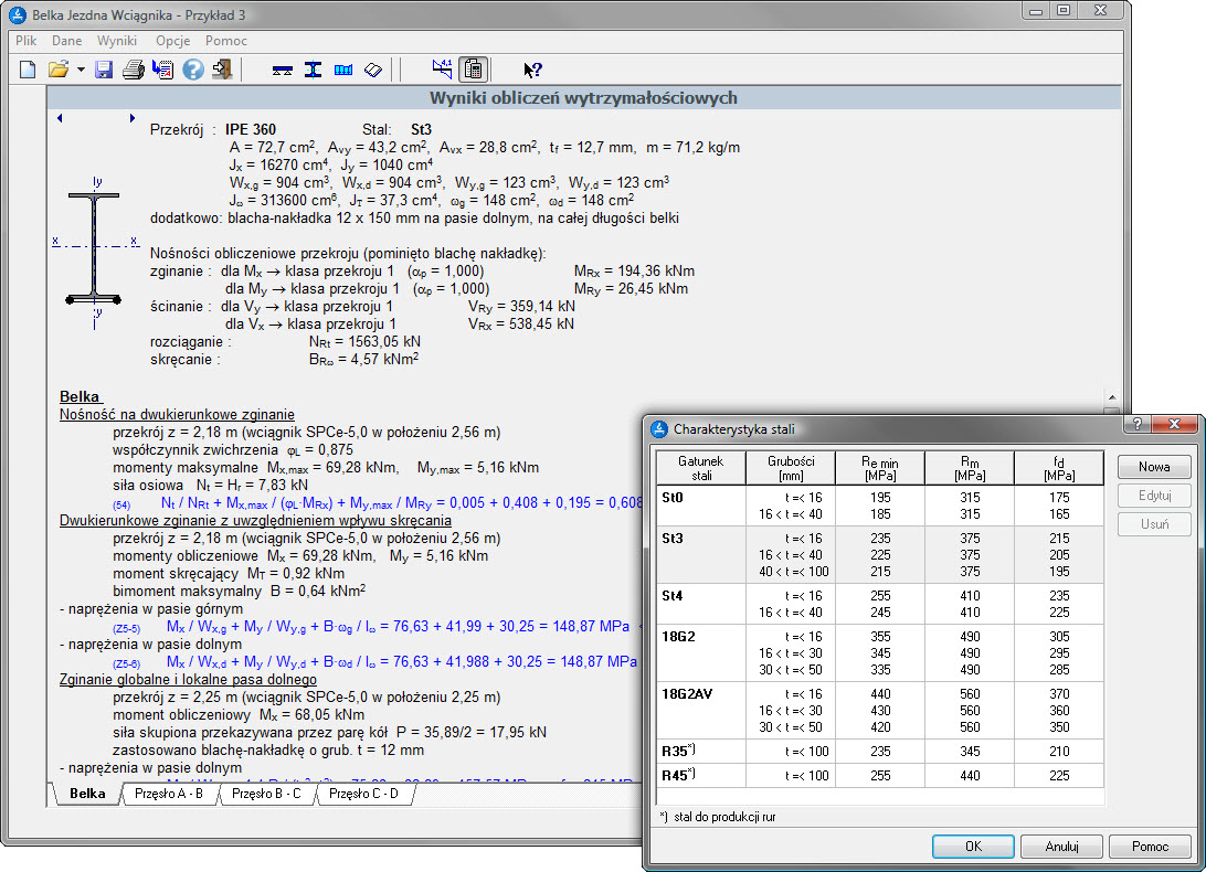 W ramach obliczeń wytrzymałościowych określona zostaje klasa przekroju i jego nośności obliczeniowe. Wyznaczany jest współczynnik zwichrzenia przy uwzględnieniu bocznego podparcia belki tylko na jej podporach oraz sposobu i poziomu przyłożenia obciążenia belki. Dla każdego przęsła sprawdzane są podstawowe warunki nośności normy stalowej PN-90/B-03200 jak dla elementu dwukierunkowo zginanego z uwzględnieniem zwichrzenia oraz warunki dodatkowe wg Załącznika 5 tej normy dotyczące dwukierunkowego zginania z uwzględnieniem skręcania i lokalnego zginania dolnej stopki dwuteownika.
