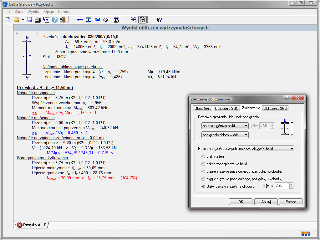 Wymiarowanie umożliwia automatyczny dobór lub sprawdzenie przekroju zadanego typu, przy wykorzystaniu bibliotek kilkudziesięciu przekrojów stosowanych na belki - profili walcowanych, spawanych lub rurowych, a także blachownic własnych użytkownika. Określona zostaje klasa przekroju i jego nośności obliczeniowe z uwzględnieniem rezerwy plastycznej lub niestateczności miejscowej. Modele analizy miejscowej niestateczności - stan krytyczny lub nadkrytyczny - pozwalają na pełne wykorzystanie nośności smukłych ścianek przekroju z uwzględnieniem ich użebrowania za pomocą poprzecznych i podłużnych żeber usztywniających. Wyznaczany jest współczynnik zwichrzenia dla zadanych warunków bocznego podparcia belki (kilka wariantów) oraz sposobu i poziomu przyłożenia obciążenia belki. Dla każdego przęsła sprawdzane są normowe warunki nośności przy zginaniu, ścinaniu i łącznym wpływie zginania ze ścinaniem. Możliwe jest wykonanie obliczeń wytrzymałościowych dla przypadku zginania dwukierunkowego. Ugięcie poszczególnych przęseł porównywane jest z ugięciem granicznym. Przekroczenie warunków normowych jest wyraźnie sygnalizowane.