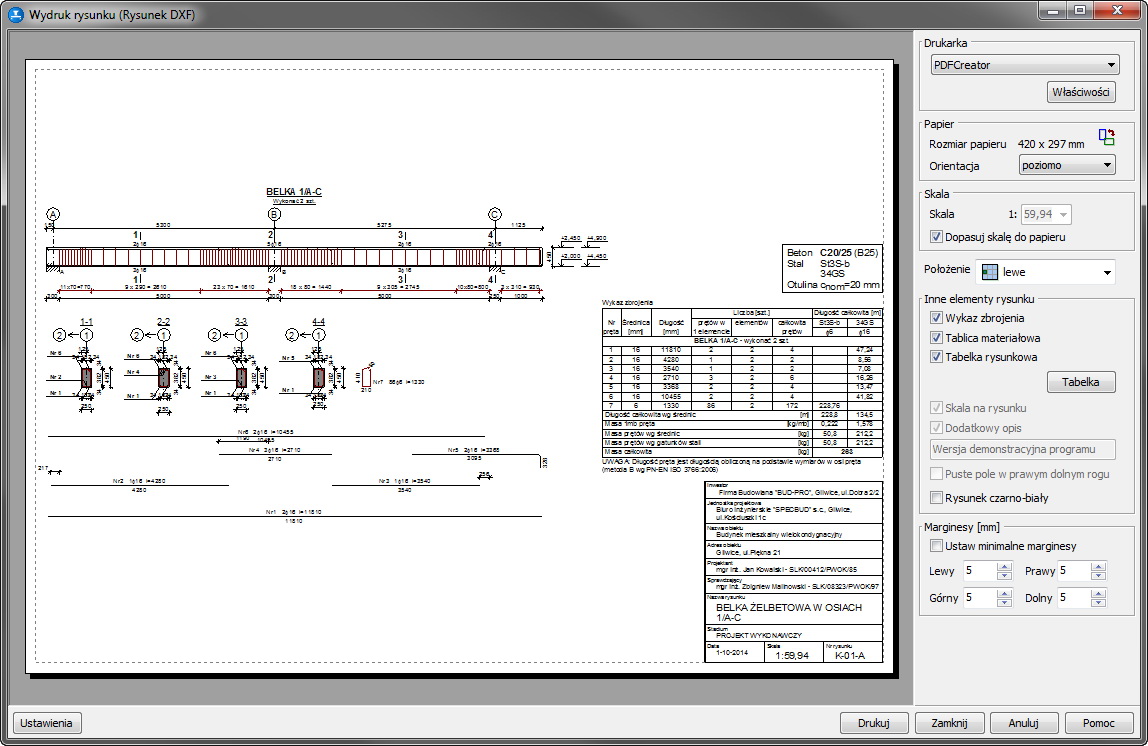 - wydruk skalowalnego rysunku bezpośrednio z programu, do czego nie jest potrzebne oprogramowanie typu CAD; opcja ta jest też bardzo przydatna do szybkiego wydruku rysunku w celu sprawdzenia jego poprawności czy dokonanych zmian;