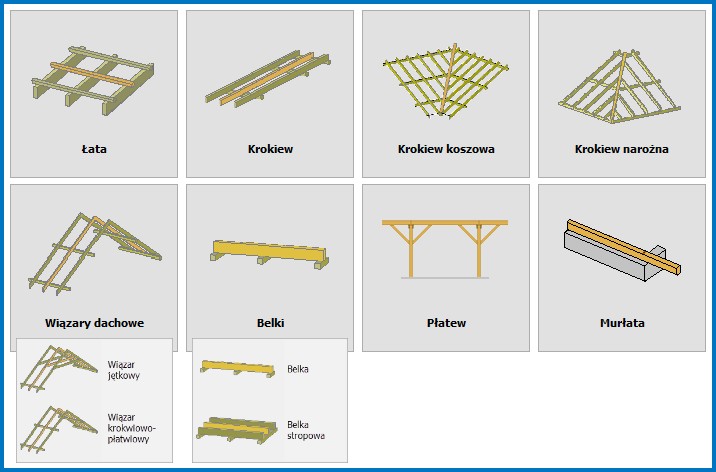 - Krokiew / Krokiew koszowa / Krokiew narożna (jedno-, dwu-, trzyprzęsłowa; z/bez wspornika)
