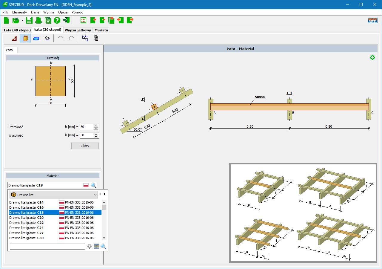 , czyli podstawowa wersja programu (bez modułów rozszerzających), uwzględnia postanowienia zawarte w Eurokodzie EN 1995-1-1 z polskim załącznikiem krajowym i wykonuje obliczenia łat, krokwi, belek, płatwi, murłat, a także wiązarów dachowych.