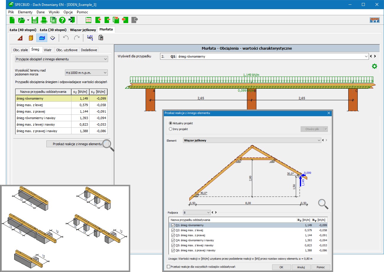 - możliwość wykorzystania współpracy z programem Kalkulator Oddziaływań Normowych EN, co pozwala na automatyczne wprowadzanie ciężarów materiałów, obciążeń użytkowych, oddziaływań klimatycznych (śnieg, wiatr), a także obciążeń zdefiniowanych przez Użytkownika;