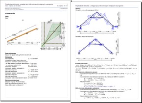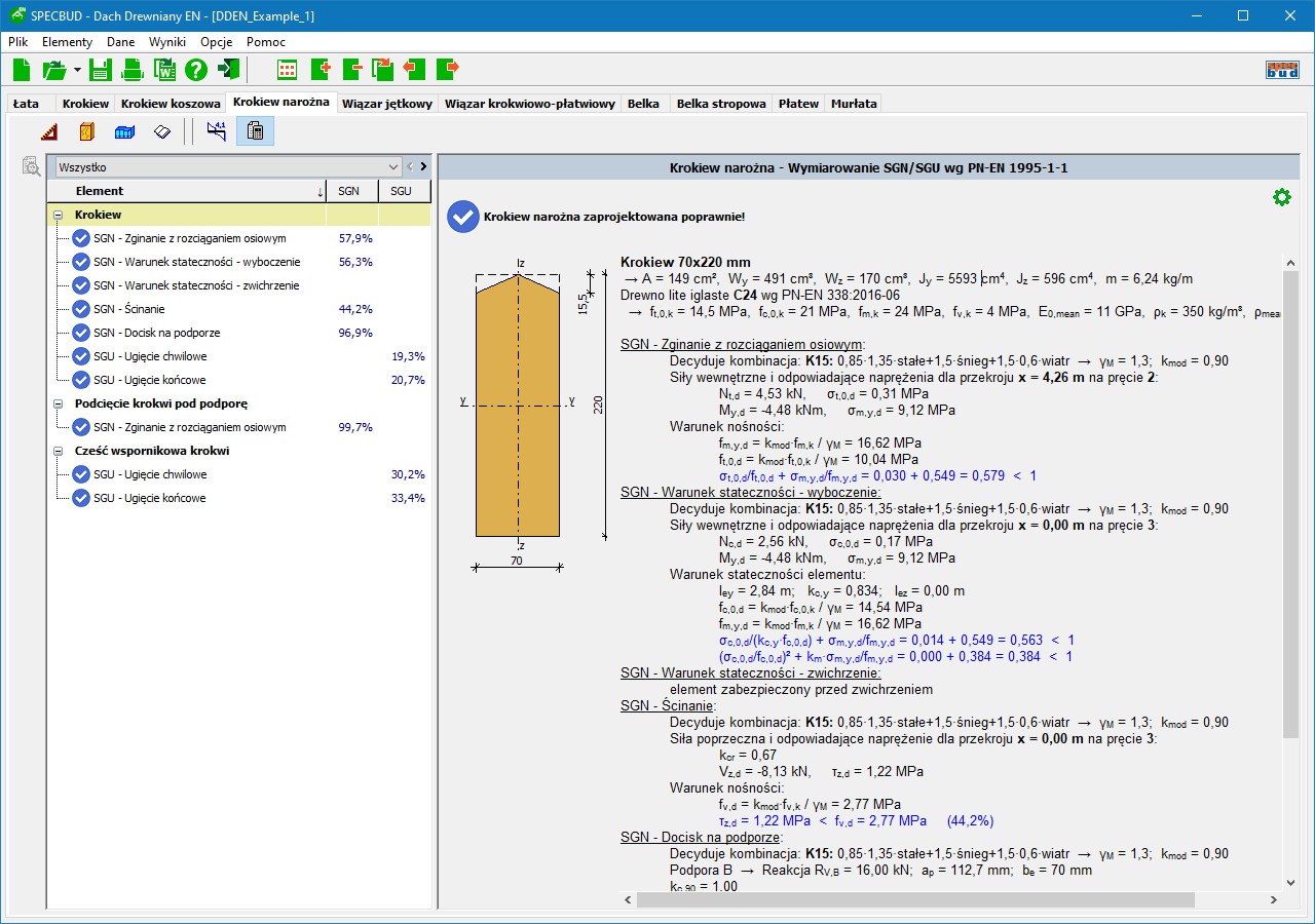 - warunki SGN i/lub SGU, poprzedzone wynikami pośrednimi (m.in. cechy geometryczne przekroju, wartości współczynników i wytrzymałości obliczeniowych drewna, miarodajne siły przekrojowe);