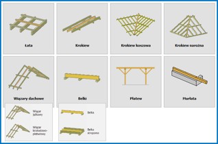 - Wiązar jętkowy / Wiązar krokwiowo-płatwiowy (symetryczny/niesymetryczny; z dodatkowymi podporami albo bez nich)