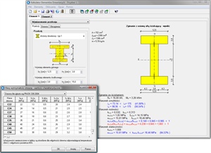 Program wykonuje obliczenia podając na bieżąco wyniki dla normowych warunków wytrzymałości przekroju i stateczności elementu (zwichrzenie belki, wyboczenie słupa) i smukłości.
