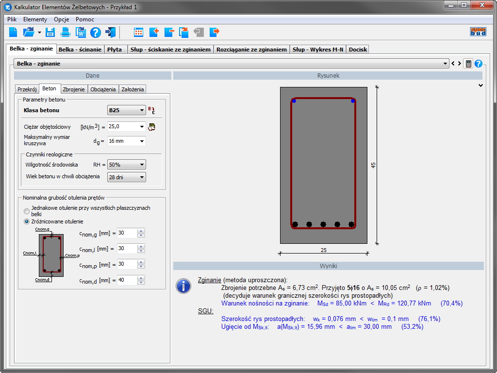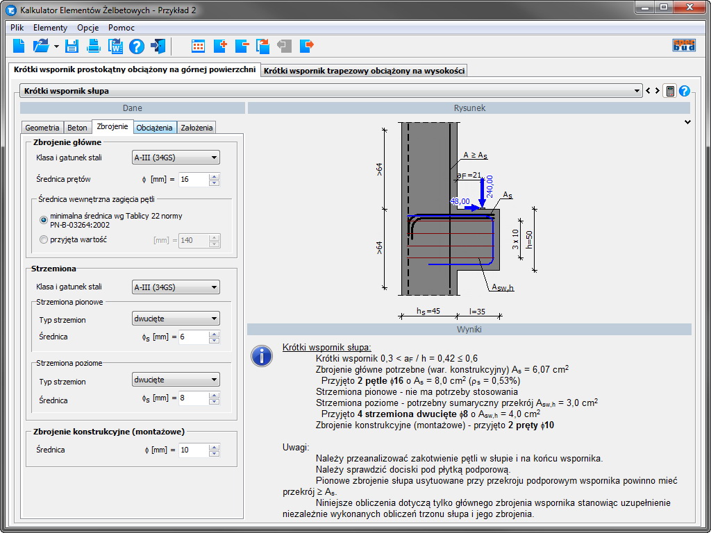 - obliczenia belek prowadzone są dla typowych przekrojów żelbetowych: prostokątnego, teowego i kątowego, zaś słupów - dla przekrojów prostokątnego i okrągłego; krótkie wsporniki słupa mogą mieć kształt prostokątny lub trapezowy,