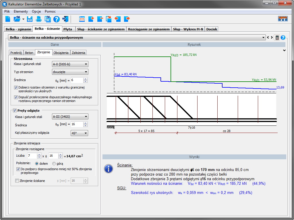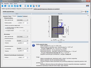 - przejrzysta budowa okna programu, z podziałem na część dotyczącą deklaracji danych do obliczeń, pole zawierające rysunek przekroju lub modelu obliczeniowego z obciążeniami oraz blok podstawowych wyników,