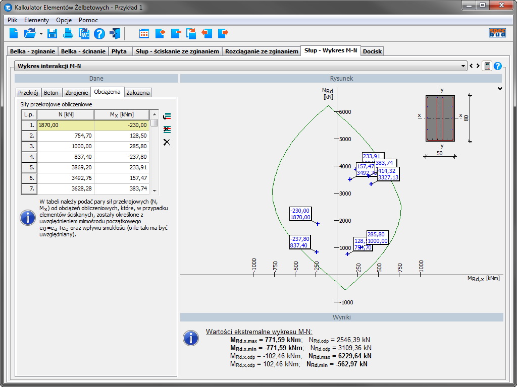 - w opcjach ‘Słup-ściskanie ze zginaniem’ i ‘Wykres interakcji M-N’ można wprowadzić w tabeli wiele zestawów obciążeń.