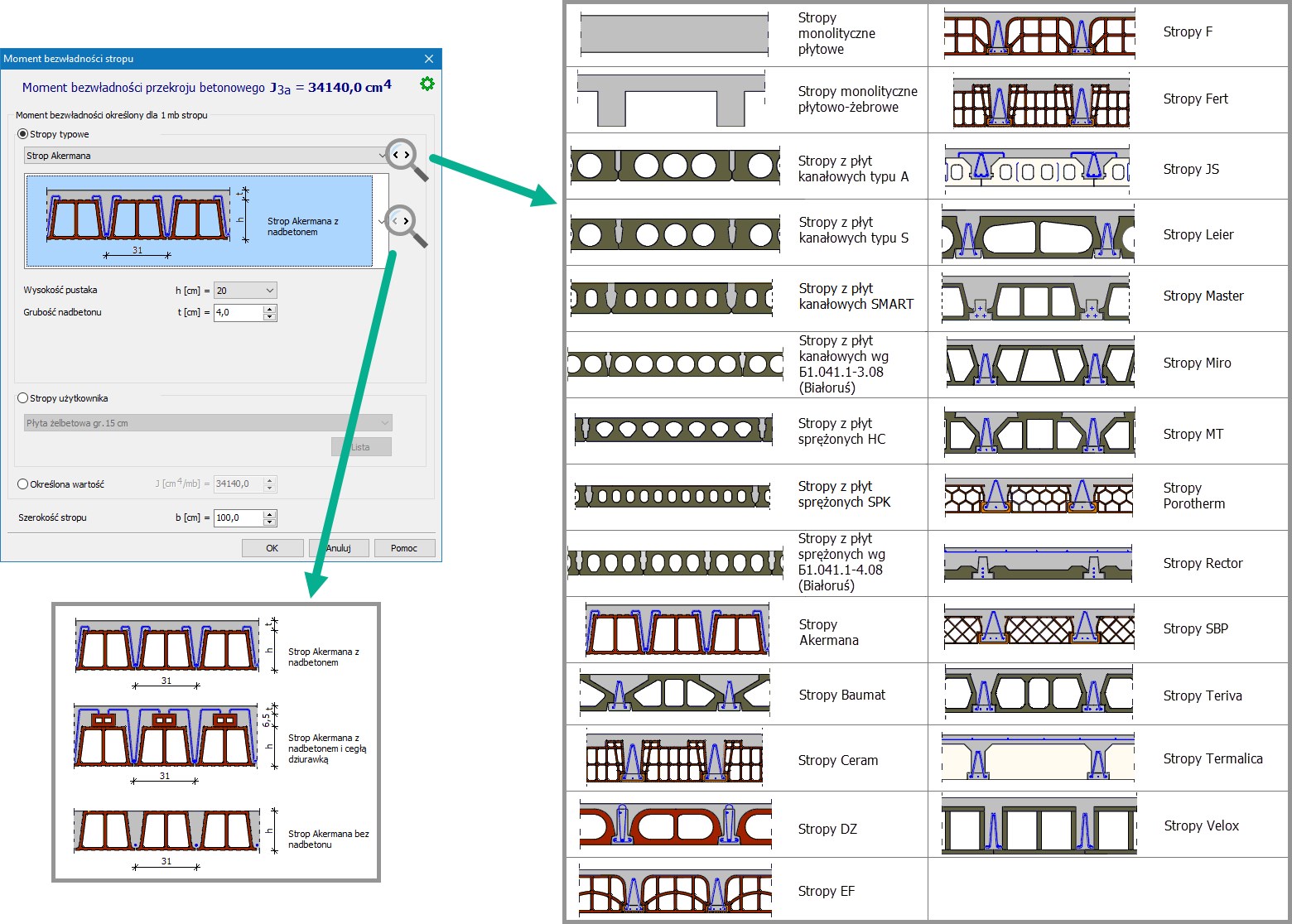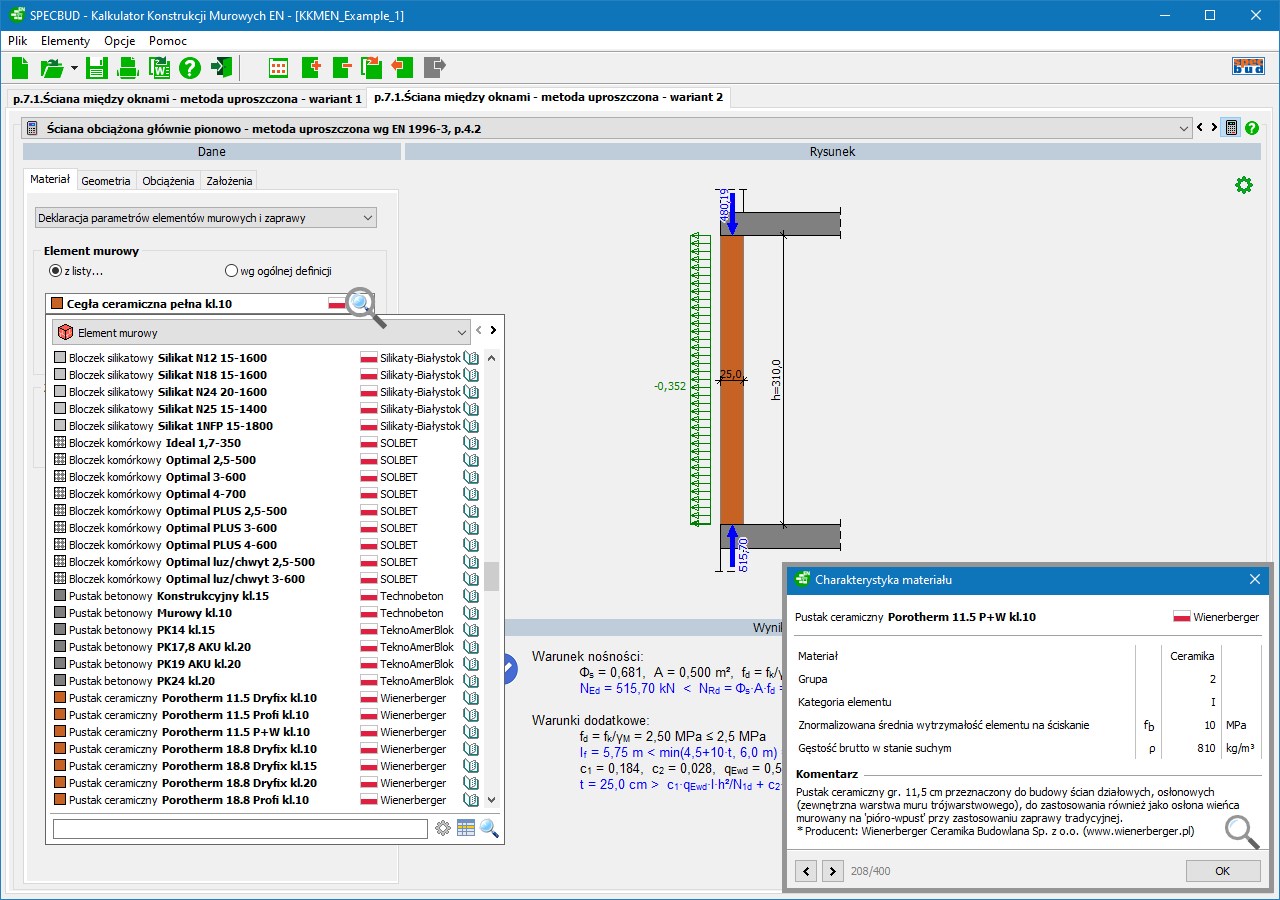 - wbudowana jest lista typowych (normowych) elementów murowych z możliwością wpisania na nią dodatkowych elementów murowych Użytkownika na podstawie własnych informacji o ich właściwościach;