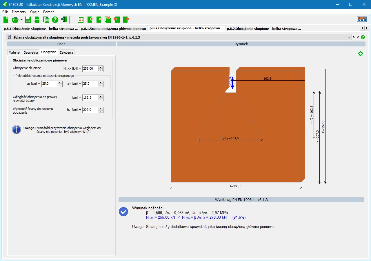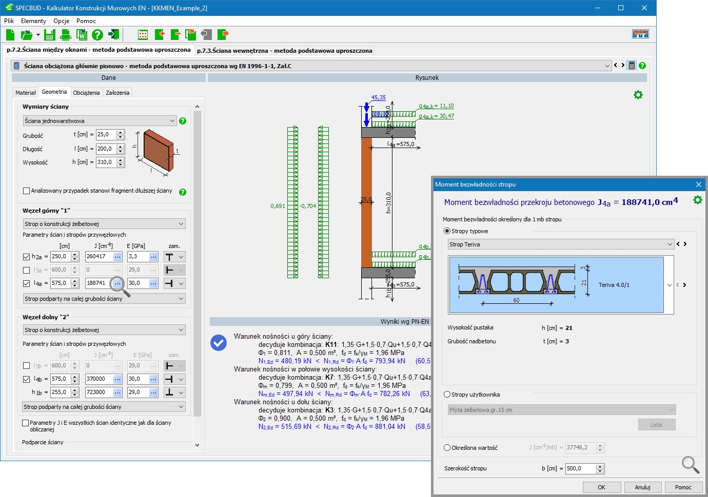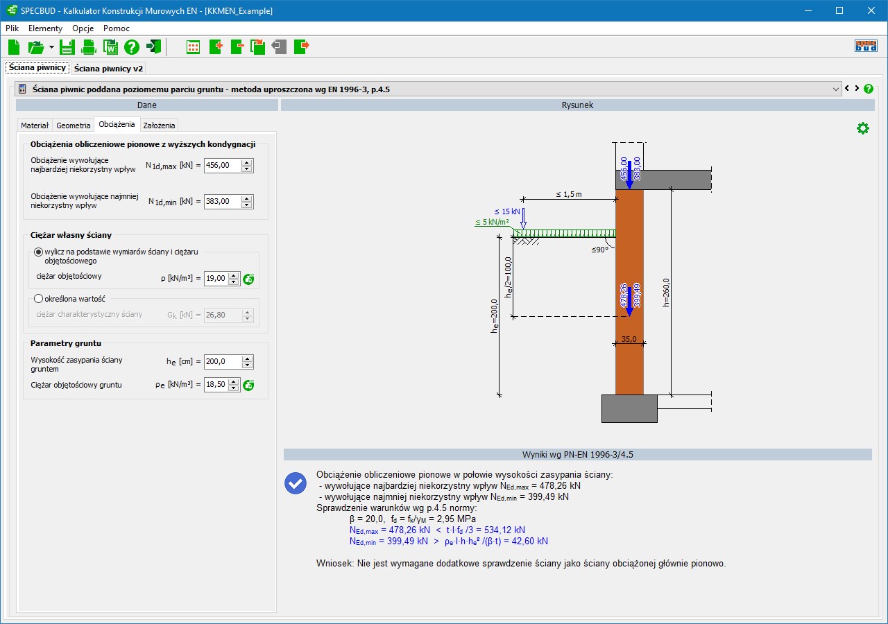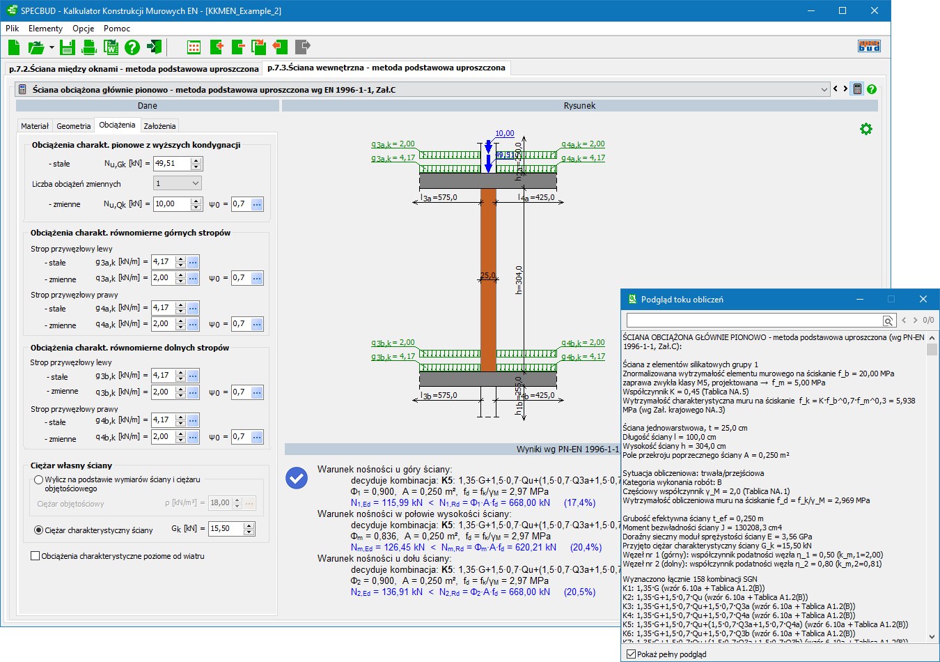 - warunki nośności sprawdzane w charakterystycznych przekrojach ściany, poprzedzone wynikami pośrednimi (cechy geometryczne, wartości współczynników i wytrzymałości, miarodajne siły przekrojowe, itd.);