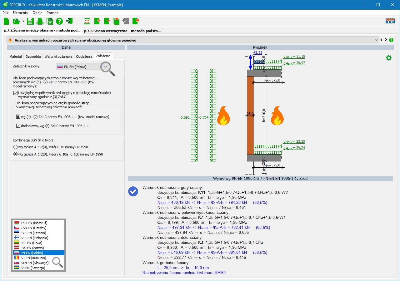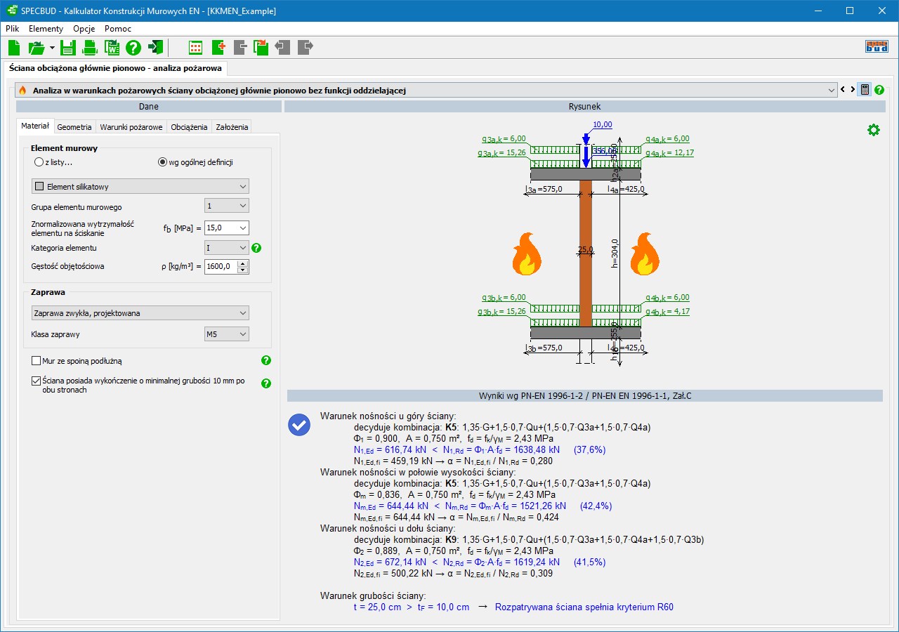 przeprowadza dodatkowo analizę konstrukcji murowych w warunkach pożarowych według postanowień zawartych w Eurokodzie EN 1996-1-2 z polskim załącznikiem krajowym.
