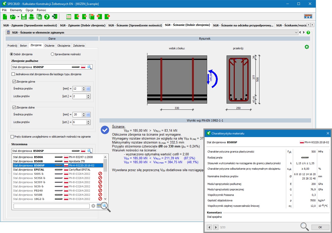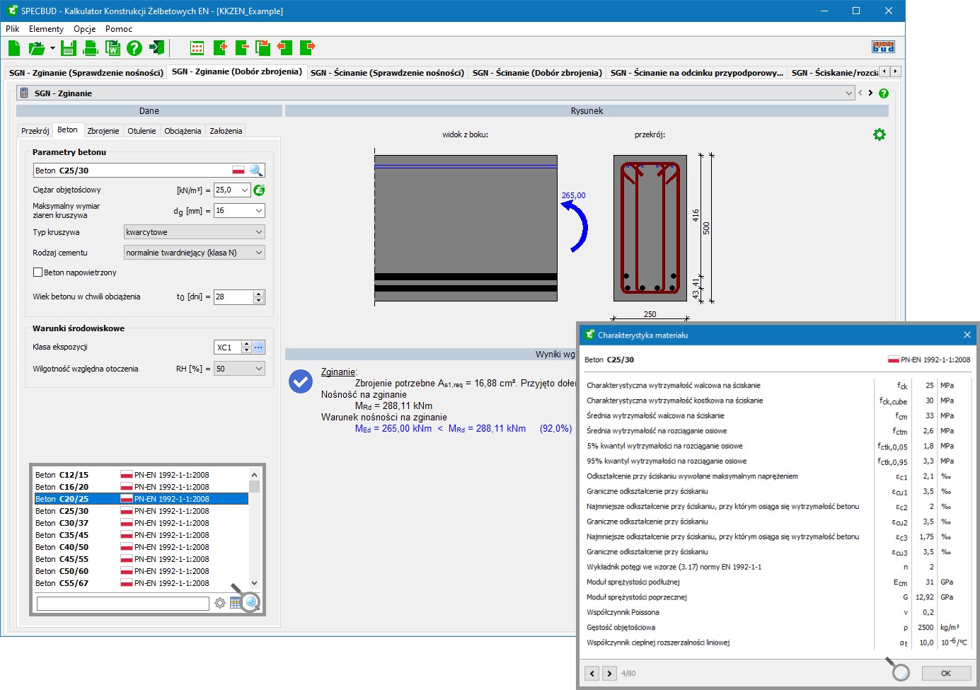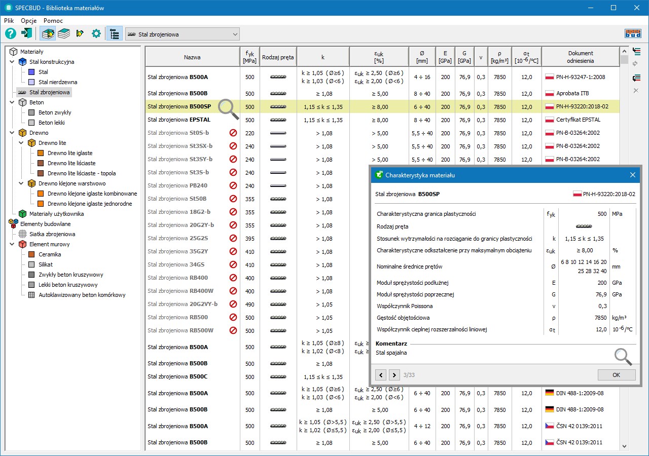 - obszerna biblioteka normowych klas betonów i stali zbrojeniowych (wg starych i nowych norm polskich i zagranicznych), z możliwością dodania nowych klas betonu i stali zbrojeniowych przez Użytkownika na podstawie własnych informacji o ich właściwościach;