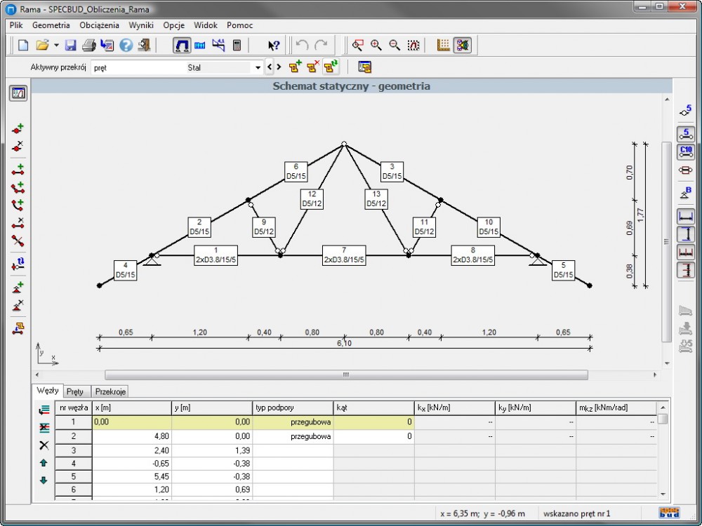 wersja: R2D v2Program służy do analizy statycznej płaskich układów prętowych (jest to program typu Rama 2D).