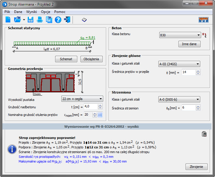 wersja: SA v5Program ten służy do obliczeń statyczno-wytrzymałościowych jednoprzęsłowych stropów Akermana zgodnie z normą żelbetową PN-B-03264:2002.