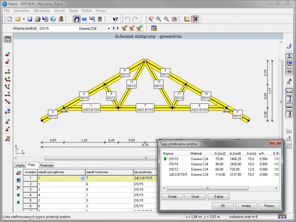 Po planowanym sprzęgnięciu tego programu z modułami wymiarującymi konstrukcje stalowe, drewniane i żelbetowe powstanie system obliczeniowy umożliwiający wykonanie kompleksowych obliczeń statyczno-wytrzymałościowych ustrojów prętowych.