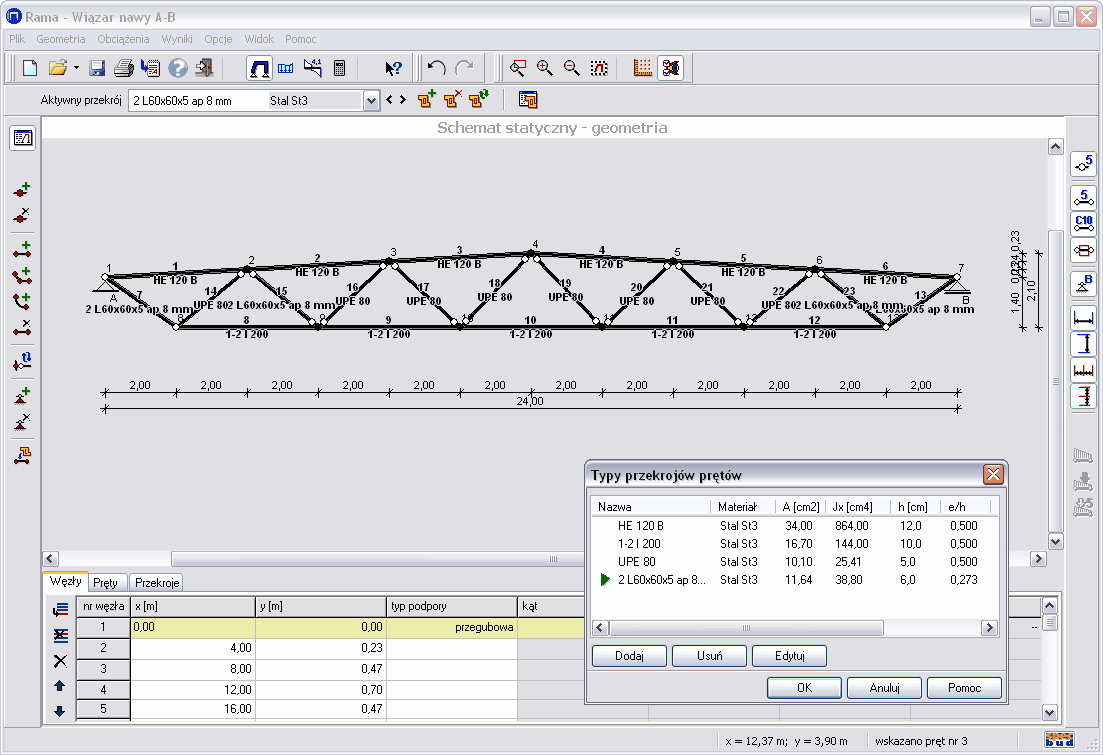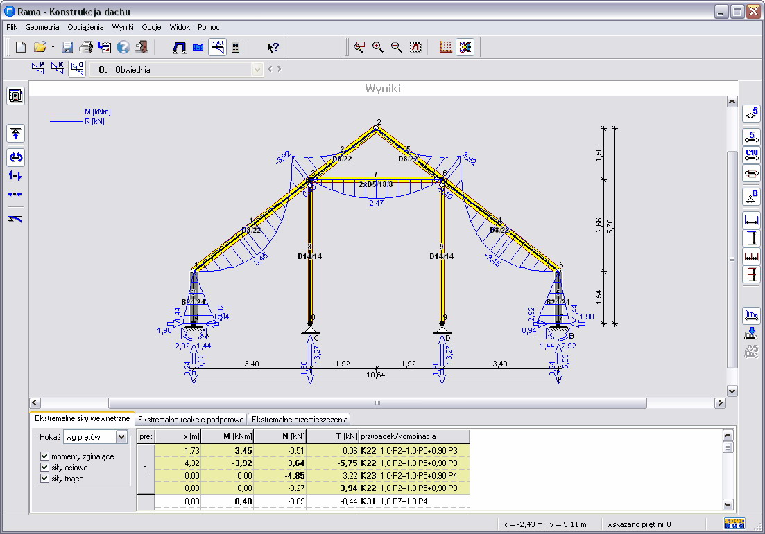wersja: R2D v2Program służy do analizy statycznej płaskich układów prętowych (jest to program typu Rama 2D).
